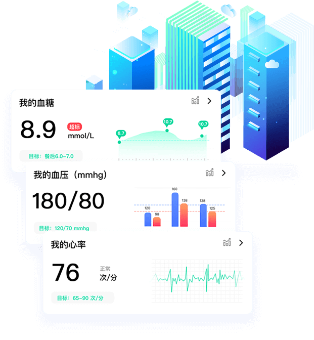 健康模塊,飽含血糖、血壓、尿酸、心率以及運(yùn)動(dòng)健康指數(shù),為用戶提供數(shù)據(jù)云儲(chǔ)存、健康預(yù)警。系統(tǒng)還可根據(jù)用戶平時(shí)的檢測(cè)指數(shù),運(yùn)算出健康目標(biāo)值